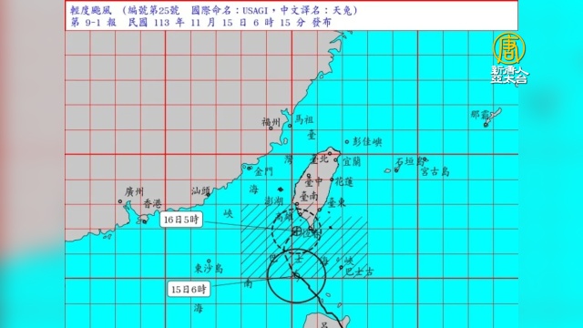【新唐人亞太台 2024 年 11 月 15 日訊】新聞首先帶您關心,氣象署已經針對高雄、屏東與恆春半島都發布陸上颱風警報,提醒當地要嚴加戒備。不過,天兔已經減弱為輕度颱風,目前持續朝西北西的方向前進。