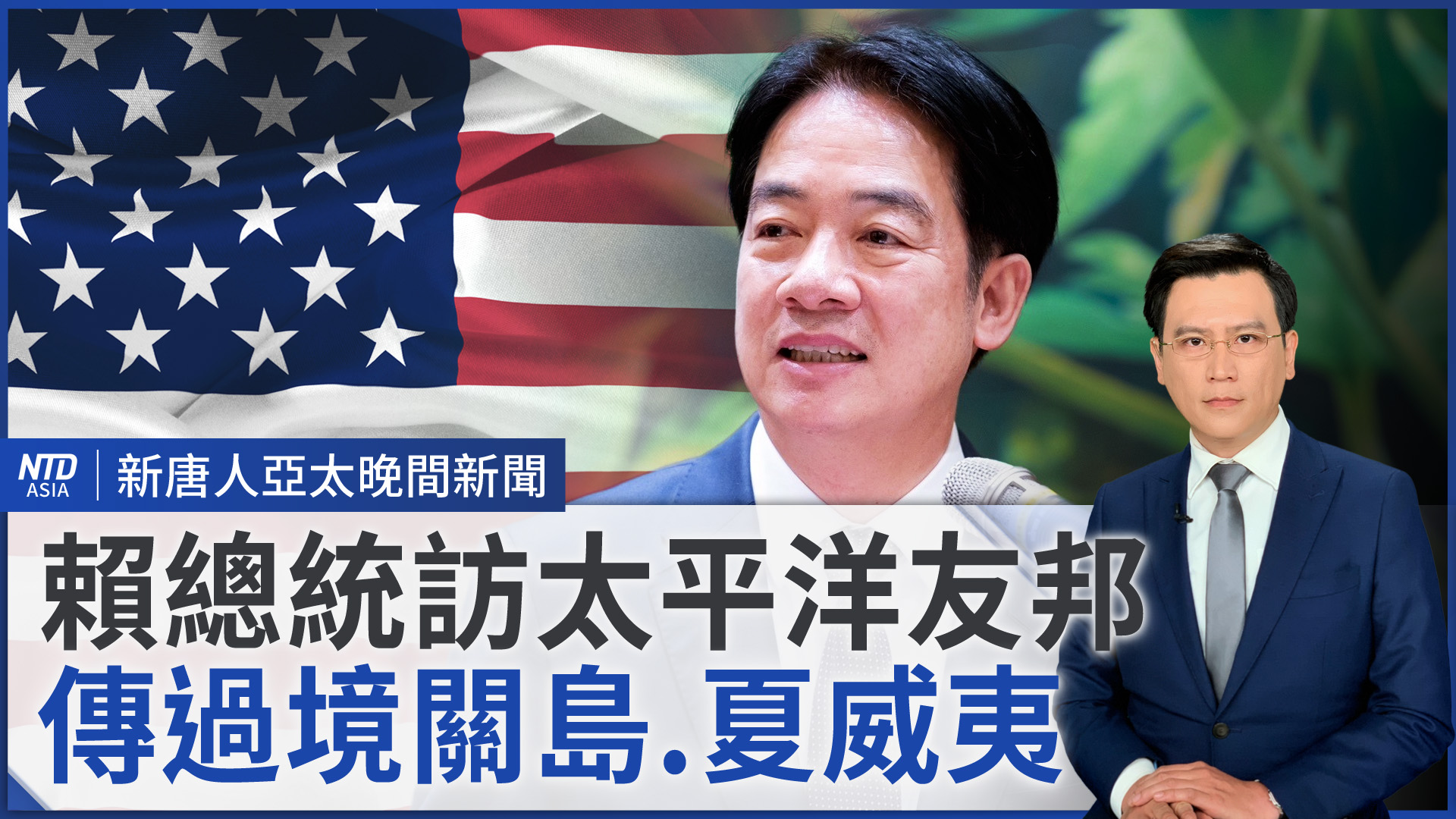 2024-12-02 07:42:38好,賴總統展開7天太平洋之行,今天他將在夏威夷發表演說。明、後天兩天拜訪友邦馬紹爾、吐瓦魯,之後再過境美國關島,星期四抵達帛琉,預計星期五返抵國門。賴總統此行過境地,都是島鏈要衝,被認為是要傳達台灣連結印太友盟的訊息。