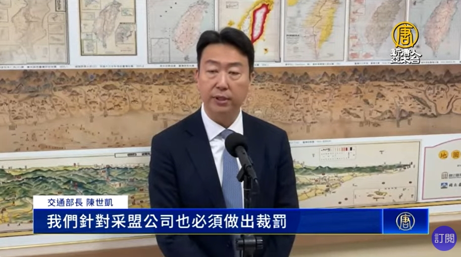 交通部長 陳世凱:「國家的運動員不是讓特定的商業公司拿來做廣告的工具,或者是道具使用,這個動作非常的不妥,而且呢,其實桃機公司在事先有跟他們做過協調,那也跟他們講過他們只能在旁邊來做加油跟迎接的動作,那不過顯然采盟公司沒有照原先的規定,那未經同意就做拍照的動作,而且未經同意就拉布條做宣傳的動作,這非常的不妥,所以我也請桃機公司,要馬上做出檢討,除此之外,我們針對采盟公司也必須做出裁罰。」