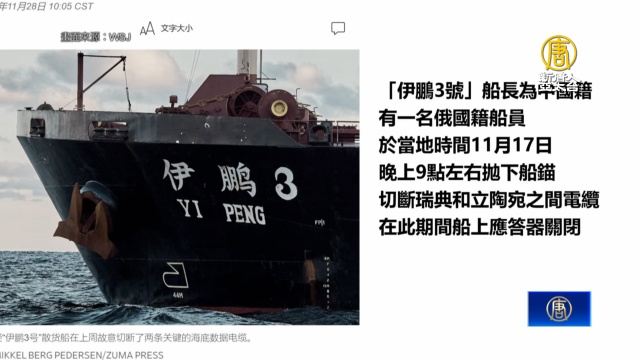 2024-11-29 13:16:32日前,波羅的海的兩條海底通訊電纜被切斷,一艘拖錨的中國商船成為嫌疑對象。瑞典已經正式要求中共配合調查。