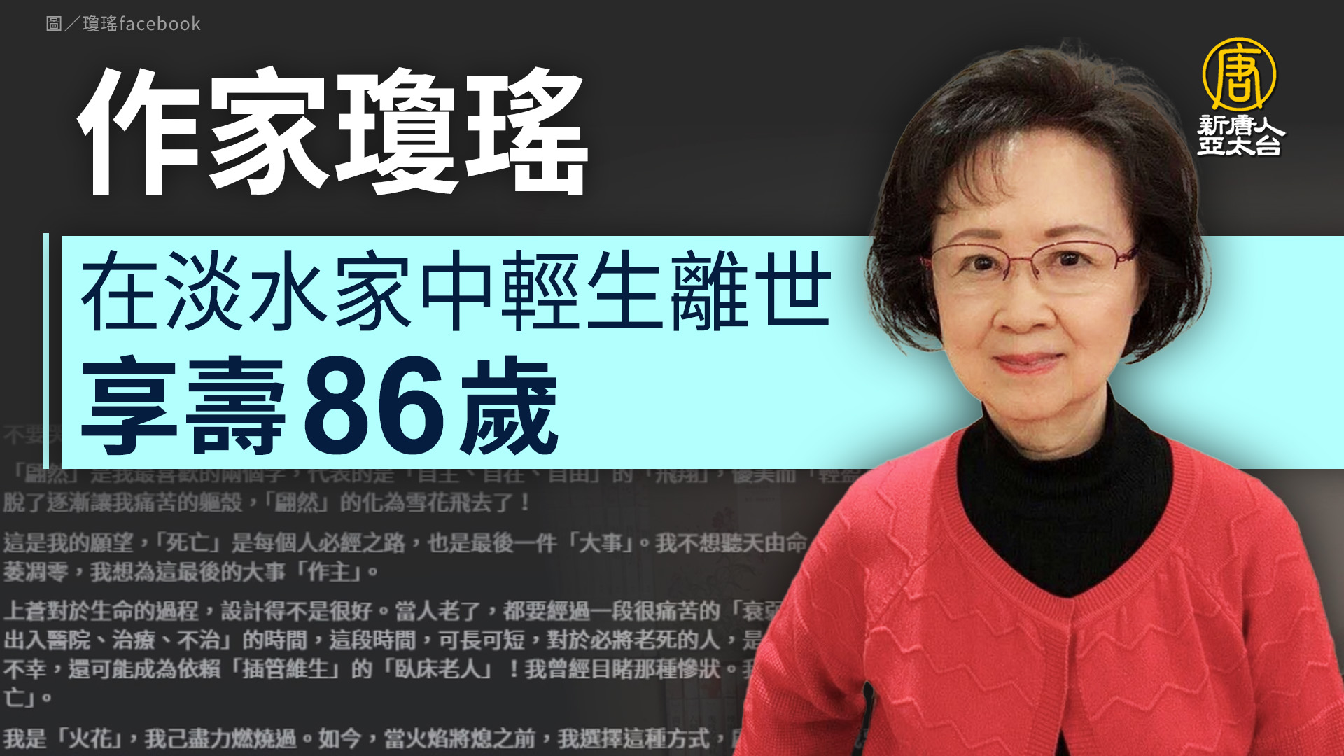 【新唐人亞太台 2024 年 12 月 04 日訊】歡迎回到新聞現場。來看到,台灣演藝圈這兩天接連傳出令人遺憾的消息,新北警消單位證實,知名作家瓊瑤今天(4日)下午在淡水區住家輕生死亡,經救護人員發現時已無呼吸心跳,明顯死亡,未送醫,享壽86歲。瓊瑤生前在臉書發文與影片表示,「這是她最後的選擇」,她還周知朋友說,「不要為她難過」,並叮囑「年輕的你們,千萬不要輕易放棄生命。」瓊瑤本名陳喆,她的小說作品,許多被改編成電影或電視劇,其中較知名的包括《庭院深深》、《一簾幽夢》、《還珠格格》等。