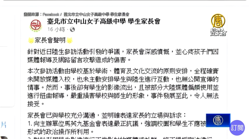 【新唐人亞太台 2024 年 12 月 05 日訊】前總統馬英九基金會邀請陸生團訪台,一行人日前參訪中山女高時,有女學生給予歡迎,卻被中國網媒稱,有如「唐僧進盤絲洞」,間接影射學生們是蜘蛛精,引起師生們的強烈不滿。對此,中山女高家長會昨晚(4日)發聲明指出,已向馬英九基金會表達嚴正抗議,強調校園和學生,不應該被以任何形式的政治操作所利用。校方也發聲明說,這起事件已造成師生及校友相當大的傷害,已經請主辦單位正視並溝通。
