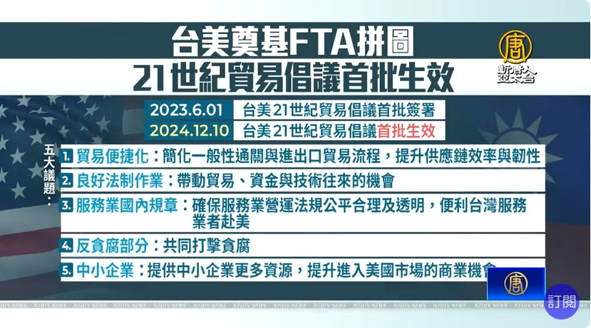 【新唐人亞太台 2024 年 12 月 10 日訊】焦點話題來看到,台美21世紀貿易倡議,去年簽署首批協定,今(10)天台美雙方發布新聞稿,宣布批協定即日起正式生效,更是雙邊關係重要里程碑。