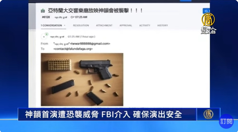 當地神韻主辦方負責人 孫大坤:「郵件的內容是用中文,就是說神韻如果要在這個音樂廳發生的話,就將會槍殺所有的人。上面有個圖片,就是子彈和槍。」