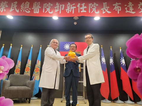 退輔會傅正誠副主任委員(中)特別南下主持屏東榮民總醫院原新任院長布達交接典禮。(屏東榮民總醫院提供)