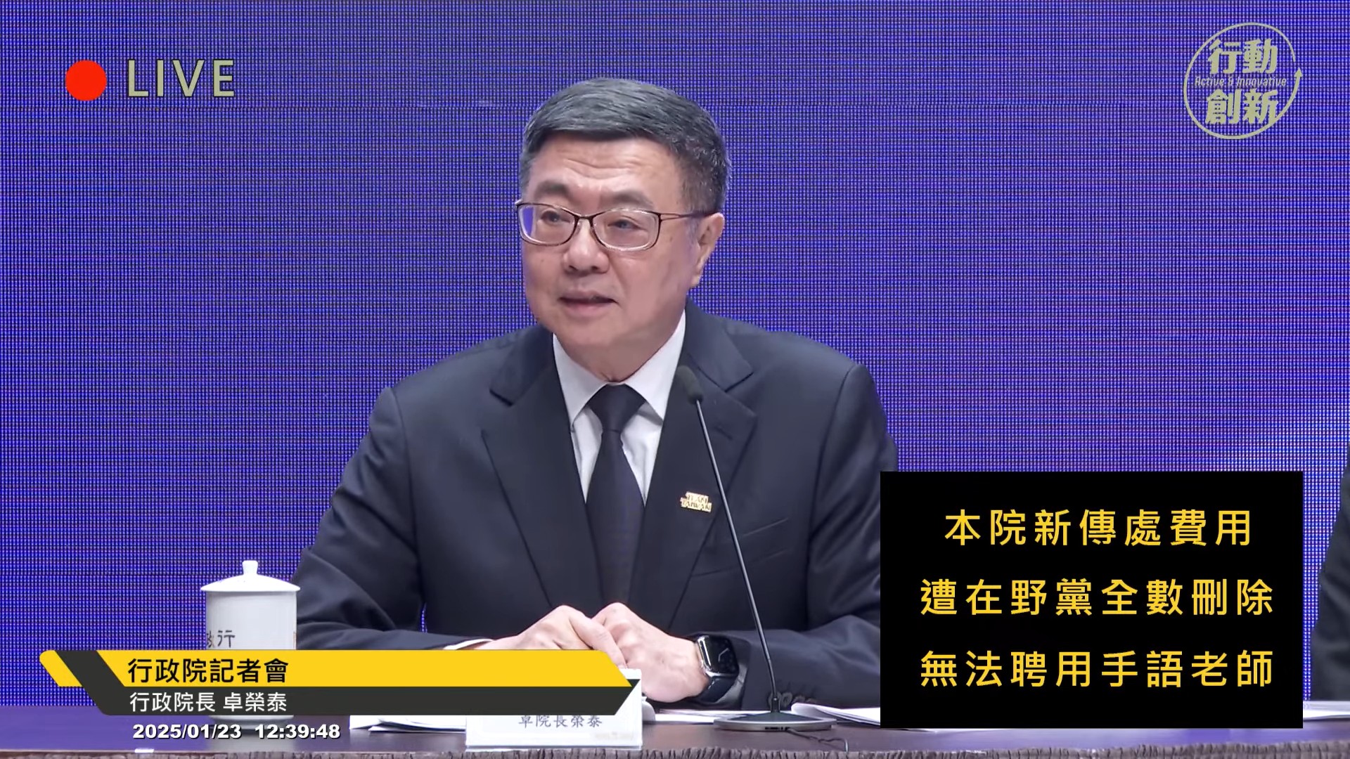 總預算遭大砍 卓榮泰記者會 「手語老師」畫面黑屏