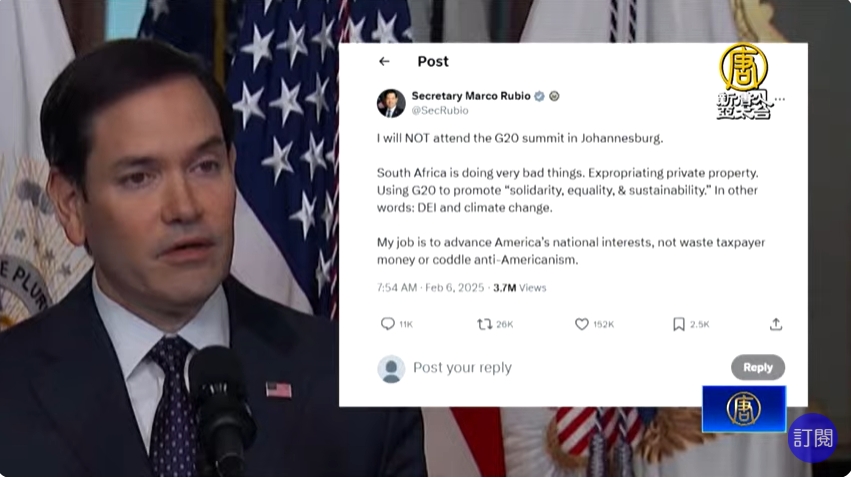 【新唐人亞太台 2025 年 02 月 06 日訊】再來看到,20國集團(G20)外長會議,這個月下旬即將在南非登場,不過美國作為全球最大經濟體,國務卿盧比歐5日發文宣布,不會出席即將在南非首都約翰尼斯堡舉辦的G20外長會議。並表示南非正在惡劣地沒收私人資產。並利用20國集團來推廣DEI(多元、公平及包容)議程,和氣候變遷。先前美國總統川普,(2日)指控南非政府惡劣對待特定族群,揚言要切斷對南非的金援後,南非總統拉瑪佛沙也出面澄清,強調沒有強徵土地,還找上南非出生的億萬富豪馬斯克通話,希望能與川普政府進行溝通。