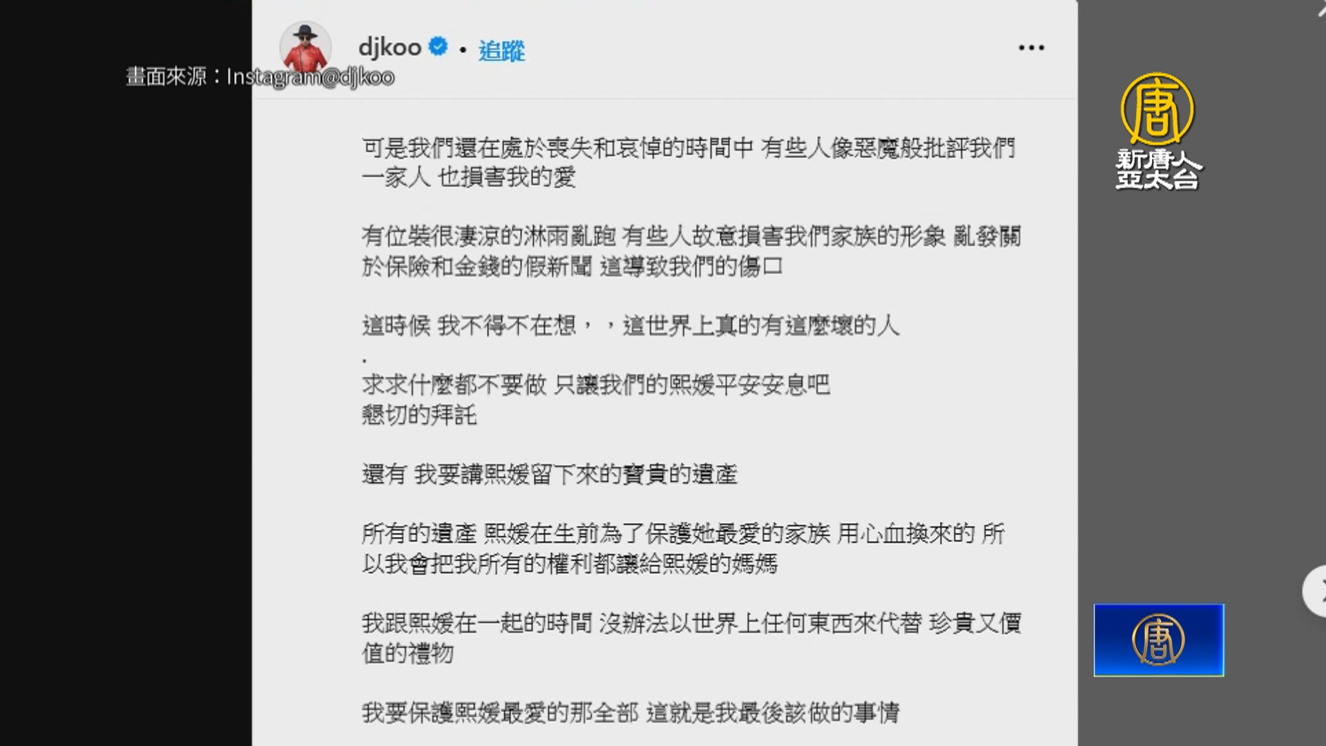【新唐人亞太台 2025 年 02 月 07 日訊】藝人大S離世,丈夫具俊曄昨晚八點半左右,發出中、韓兩版本聲明,他先提到,自己正經歷無法語言形容的悲傷和痛苦,卻有人故意損害他們家族形象,亂發關於保險和金錢的假新聞,談到遺產議題時,他說,會把自己所有的權利都讓給熙媛的媽媽。