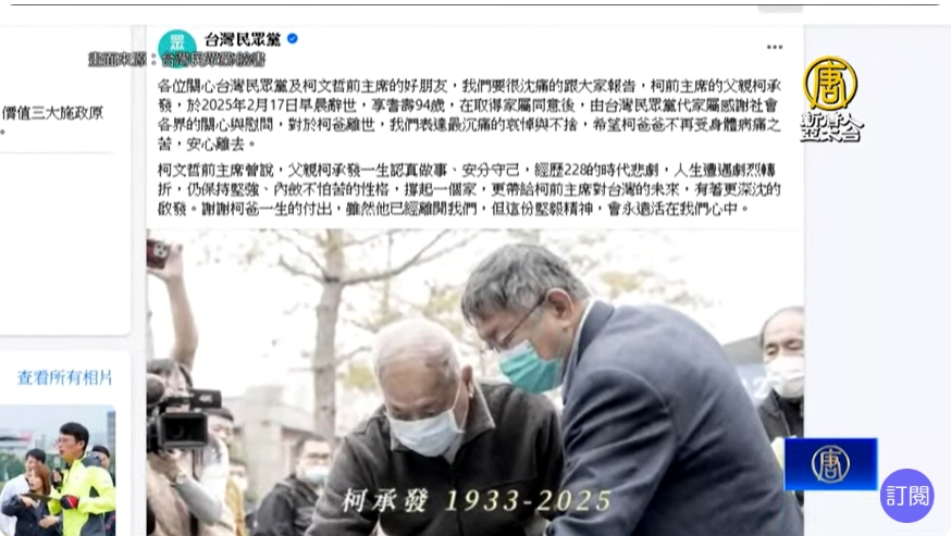 【新唐人亞太台 2025 年 02 月 17 日訊】再來看到,民眾黨前主席柯文哲父親柯承發,今天上午8點40分在新竹台大醫院病逝,享耆壽94歲。柯文哲父親先前多次傳出病危消息,15日,柯爸再度傳出病情惡化,柯文哲家屬向台北看守所提出申請,經矯正署核准後柯文哲16日凌晨12點多在戒護下,前往新竹台大醫院探視。柯文哲因京華城、政治獻金案遭起訴,並羈押至今,台北看守所回應,後續將注意柯文哲的身心狀況,若家屬提出返家探視申請,所方原則上會准許。民眾黨上午發聲明提到,柯承發經歷228的時代悲劇,人生遭遇劇烈轉折,仍保持堅強、內斂不怕苦的性格。對於柯爸離世,表達最沉痛的哀悼與不捨。