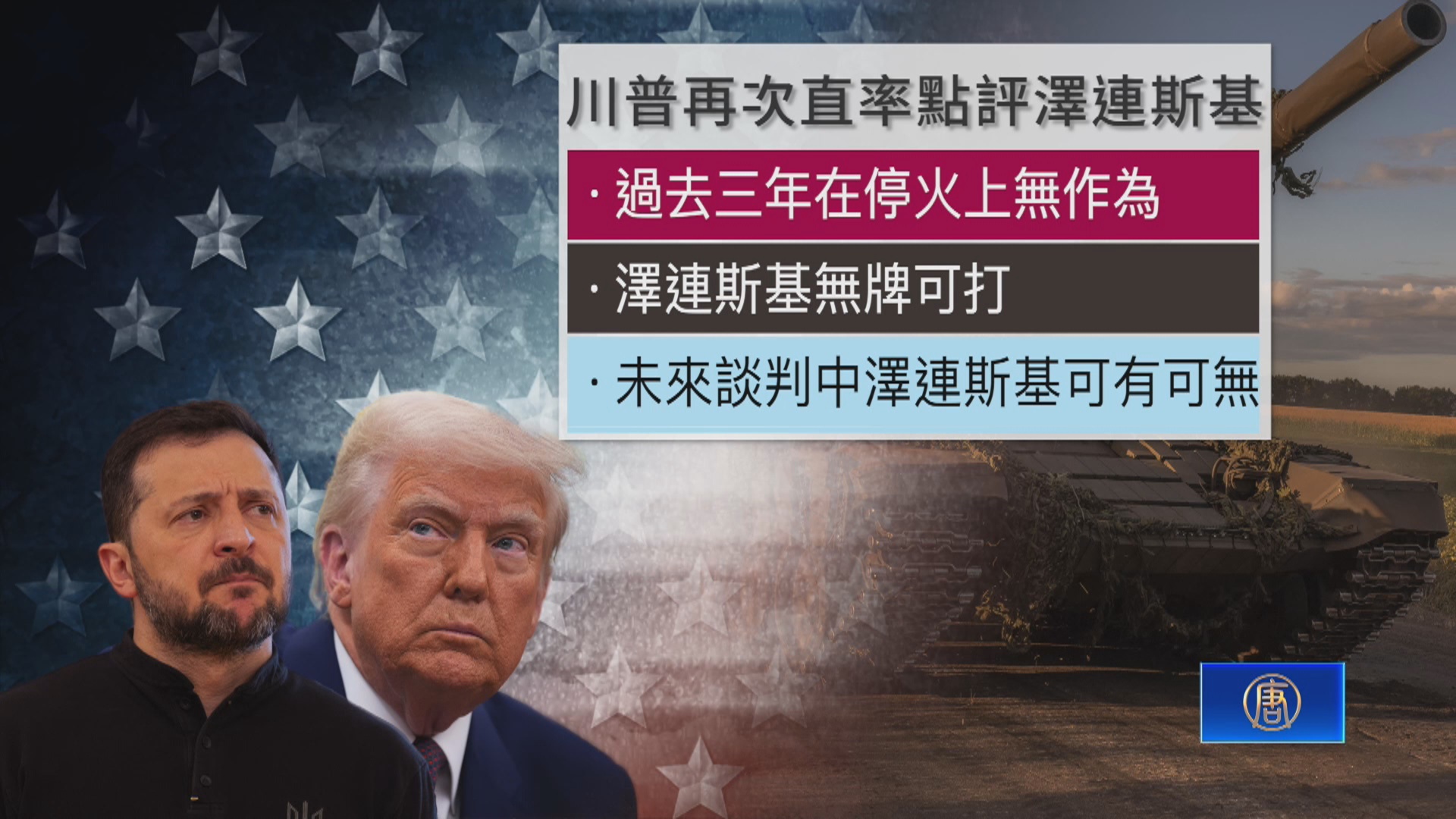 他表示過去三年澤倫斯基的作法對於達成停火協議而言非常不利。川普坦言,未來談判桌上有沒有澤倫斯基 並不重要。