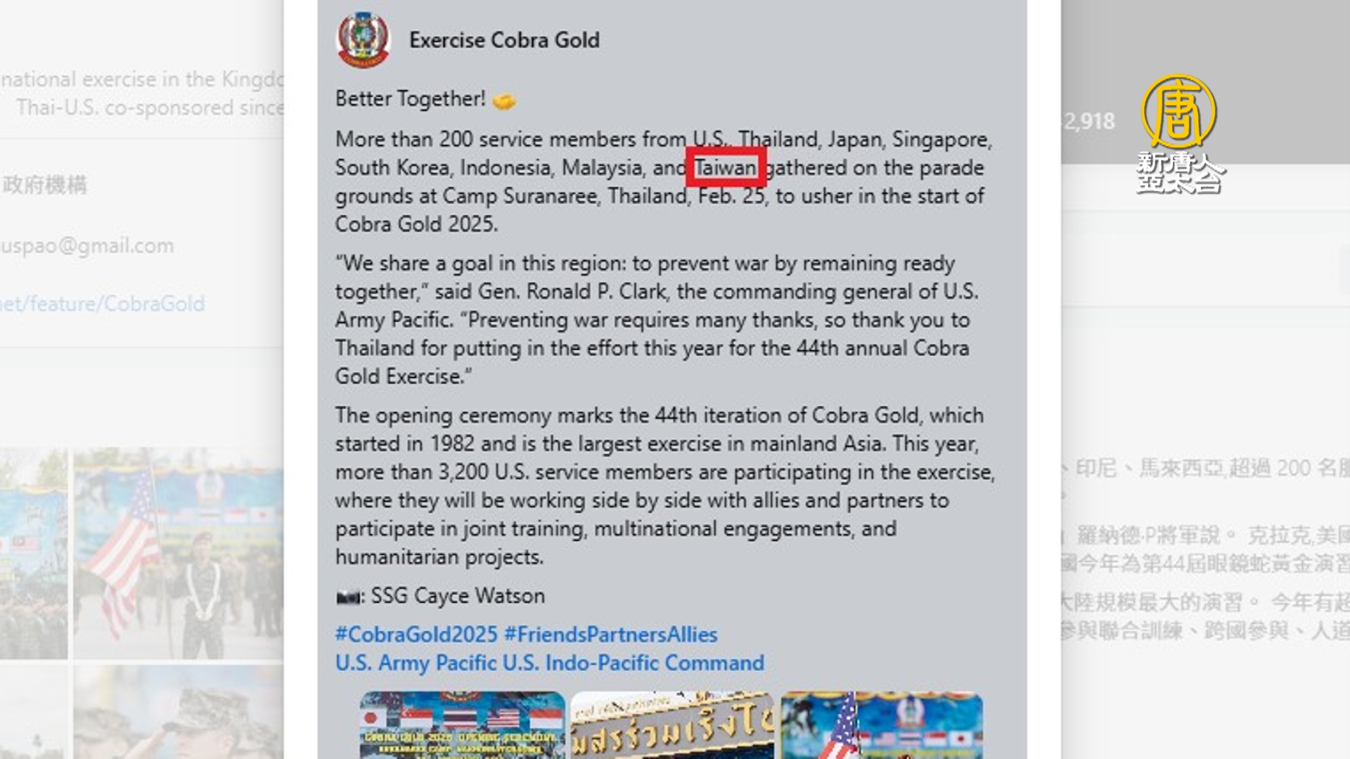 【新唐人亞太台 2025 年 02 月 26 日訊】歡迎回來,美軍官方「金色眼鏡蛇演習(Exercise Cobra Gold)」的社群媒體昨天發文指出,台灣與美、泰、日、星、韓、印尼、馬來西亞等國,超過200名官兵齊聚泰國,共同為「金色眼鏡蛇2025軍演」揭開序幕。這是美軍首度公開證實台灣參與金色眼鏡蛇軍演,相關消息在媒體曝光後,貼文維持約3小時,昨晚9點14分修改,刪除文中的「Taiwan」,但貼文的編輯紀錄仍可查到原始貼文中明確提到「Taiwan」。