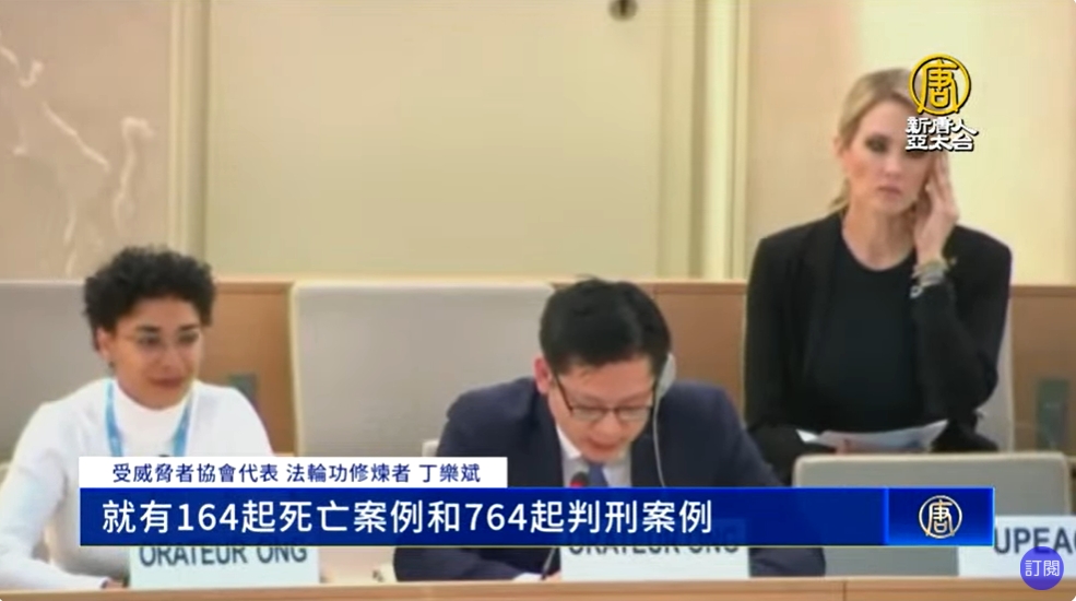 受威脅者協會代表 法輪功修煉者 丁樂斌:「自1999年7月以來,中共政府一直在進行系統性的迫害(法輪功學員),以滅絕(eradicate )中國的精神修煉,法輪功。當時(的中共黨魁)江澤民下令對法輪功修煉者,名譽上搞臭、經濟上搞垮、肉體上消滅。」「僅在2024年,就有164起死亡案例被記錄,還有7起死亡案例……」