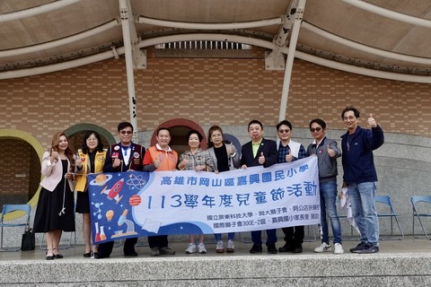 屏科大徐子圭教授(右3)結合阿公店扶輪社陳金波社長(右4)及岡大獅子會蔡逸倫會長(左3)在嘉興國小共同辦理兒童節科普闖關活動(屏科大 提供)