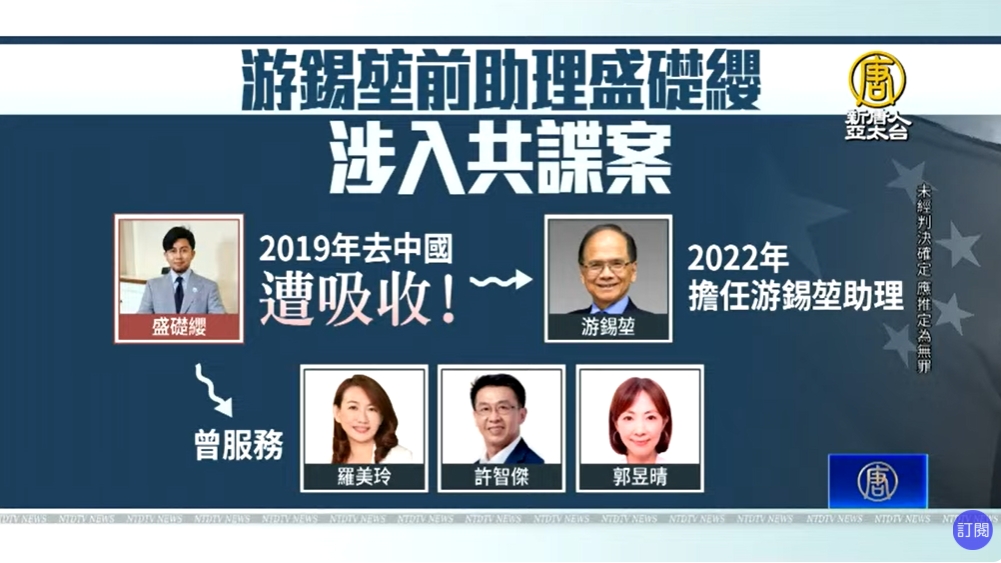 台灣又爆出共諜案,前立法院長游錫堃的助理盛礎纓,疑似被滲透,涉嫌將機密資料洩漏給中共,日前遭到台北地檢署偵辦,以20萬元新台幣交保。游錫堃向媒體表示,他在聘任後發現盛礎纓的行為有點異常,因此沒有再續聘,對於案件沒有特別意見,只期盼勿枉勿縱。