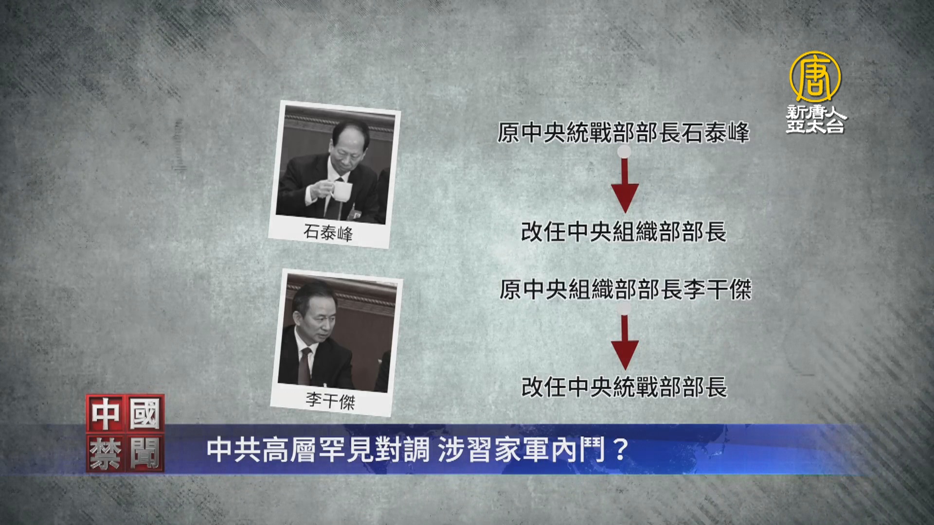 中共政治局兩名委員的職務罕見出現對調,原中央統戰部部長石泰峰改任中央組織部部長,而原中央組織部部長李干傑則改任中央統戰部部長。