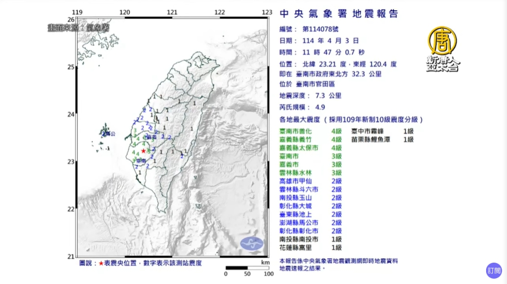 【新唐人亞太台 2025 年 04 月 03 日訊】新聞首先,帶您看到最新訊息,今天上午11點47分,台灣發生芮氏規模4.9地震,深度為7.3公里,震央位在台南市政府東北方32.3公里,最大震度為台南市與嘉義縣4級。稍早氣象署對雲林縣、嘉義市、嘉義縣、台南市發布國家級警報,下午一點,氣象署將召開記者會說明。