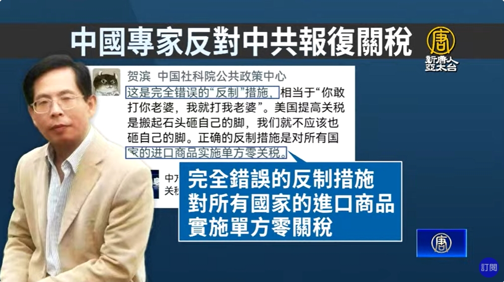 不過許多中國專家紛紛反對中共對美國進行報復,中國社科院公共政策研究中心的副主任賀濱,6日發文說,這是完全錯誤的反制措施,正確應該是要「對所有國家的進口商品實施單方零關稅」。結果不到一天,賀濱所屬的機構就被關閉了。