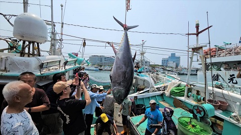 【新唐人亞太台 2025 年 04 月 07 日訊】2025屏東東港第一鮪報到!東港漁業電台於6日凌晨接獲東港籍漁船「茂豐祥號」通報,在台灣東南方海域捕獲一尾公黑鮪魚,今天(7日)在東港舉行「驗魚」活動,確認符合起鉤活魚、捕撈海域、重量超過180公斤且第一個返港,由東港籍漁船茂豐祥號奪得今年「第一鮪」資格,屏東縣政府與東港區漁會預計在11日舉辦第一鮪拍賣會。