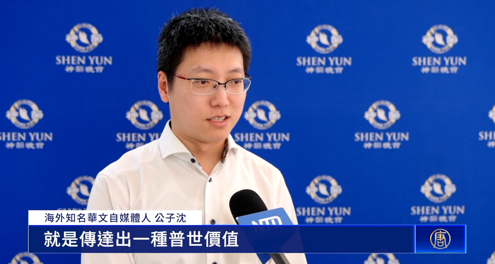 海外知名華文自媒體人 公子沈:「第一次感受到,古典的舞蹈或者文化可以跟現代的科技相結合,確實是讓人耳目一新。特別好,特別感受到,古代的文化能夠進入到現代社會,特別是被西方主流社會所認知、所接受,我覺得這是神韻很大的功勞。我上中學的時候很喜歡中國的古典文學,當時還嘗試去寫古體詩,嘗試寫現代詩,好長時間都沒碰這些中文、這些古典的內容了。今天看到中國傳統的、古典舞蹈、音樂,感覺還是很好的。所謂的民族的就是世界的。這些民族的藝術,包括上千年前的傳統文化,她還是有一些精華的,把這些精華提煉出來,去掉糟粕,然後給大家展示,這些精華其實跟現代的普世價值是相吻合的,這是我看這次演出的一個最大的感受,就是傳達出一種普世價值。所以才能被現代文明社會所接受。大家同時感受到這種古代的、跟現代生活與眾不同的呈現方式,我覺得確實是對現代的多元文化,包括現代的文明都增添了很多有價值的東西。」