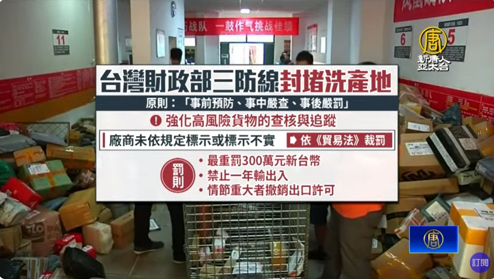 台灣財政部建立「事前預防、事中嚴查、事後嚴罰」三道防線,強化高風險貨物的查核與追蹤,如查獲廠商未依規定標示或標示不實,將移送經濟部依《貿易法》裁罰,最重罰300萬元或禁止一年輸出入,情節重大者撤銷出口許可。