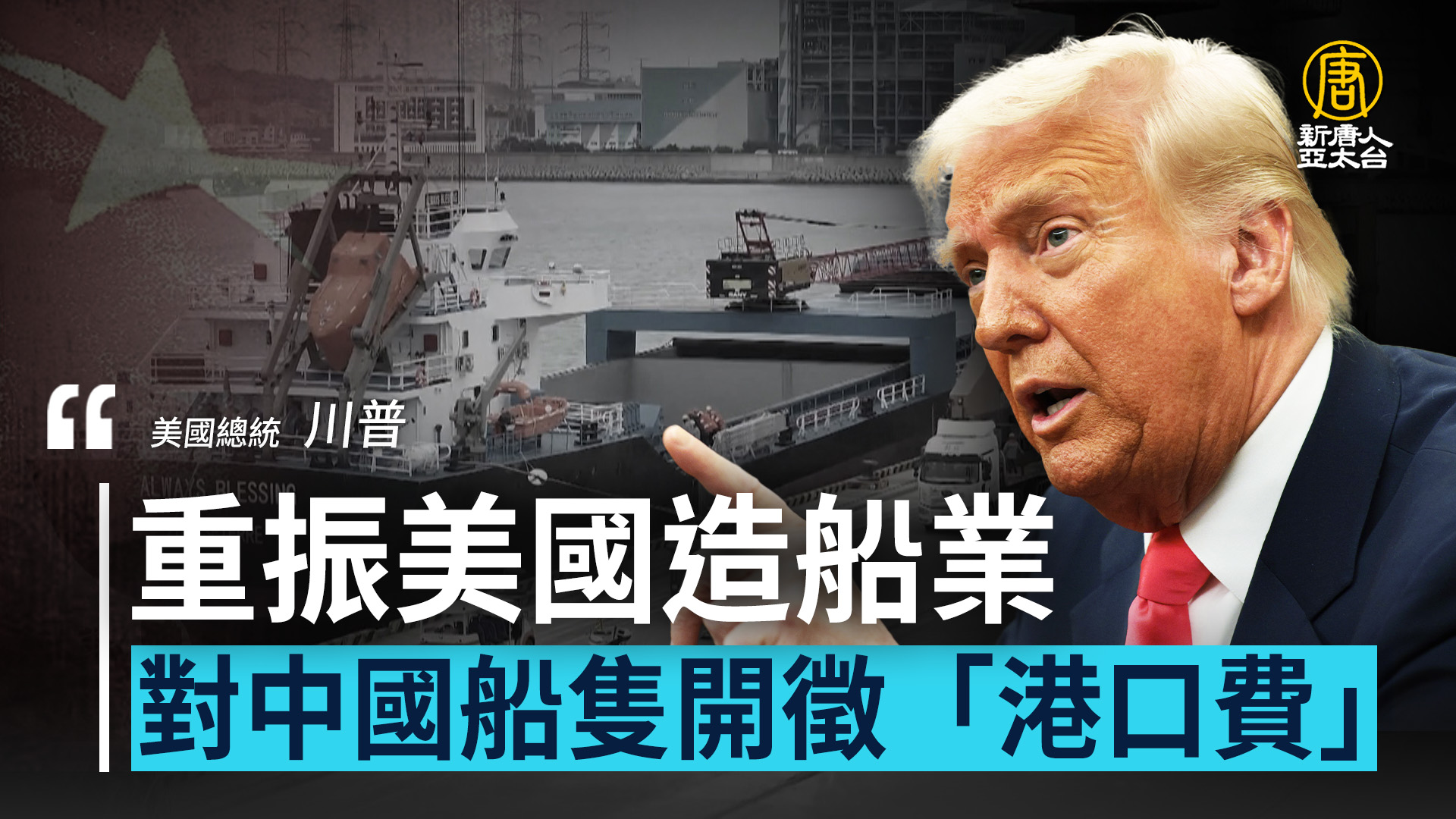 【新唐人亞太台 2025 年 04 月 18 日訊】新聞首先來關心,美國貿易代表署,週四公布港口費計畫,將對中國船隻徵收高額港口費用,同時豁免非中國船東靠港費用。這項計畫被視為,川普政府振興美國造船業,打擊中共在全球海運市場不公平貿易行為的重要行動。