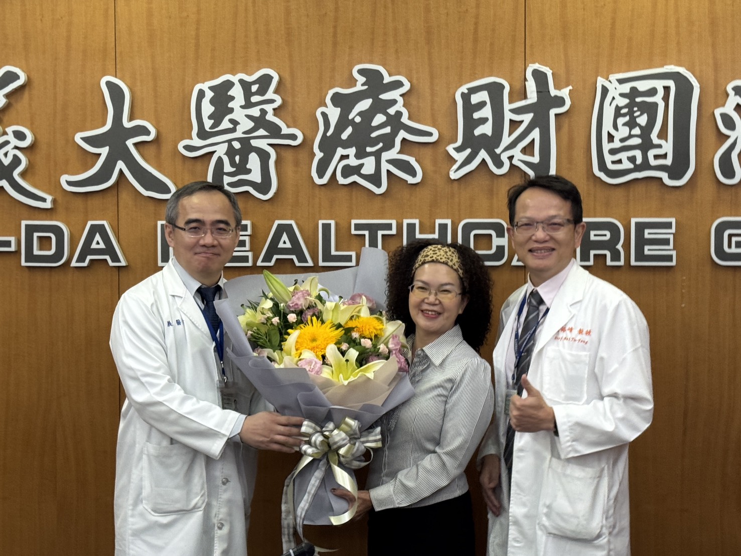 義大癌治療醫院胸腔內科主任吳俊廷(左)送花給肺腺癌患者黃琬茹(右)。(高雄義大醫院提供)
