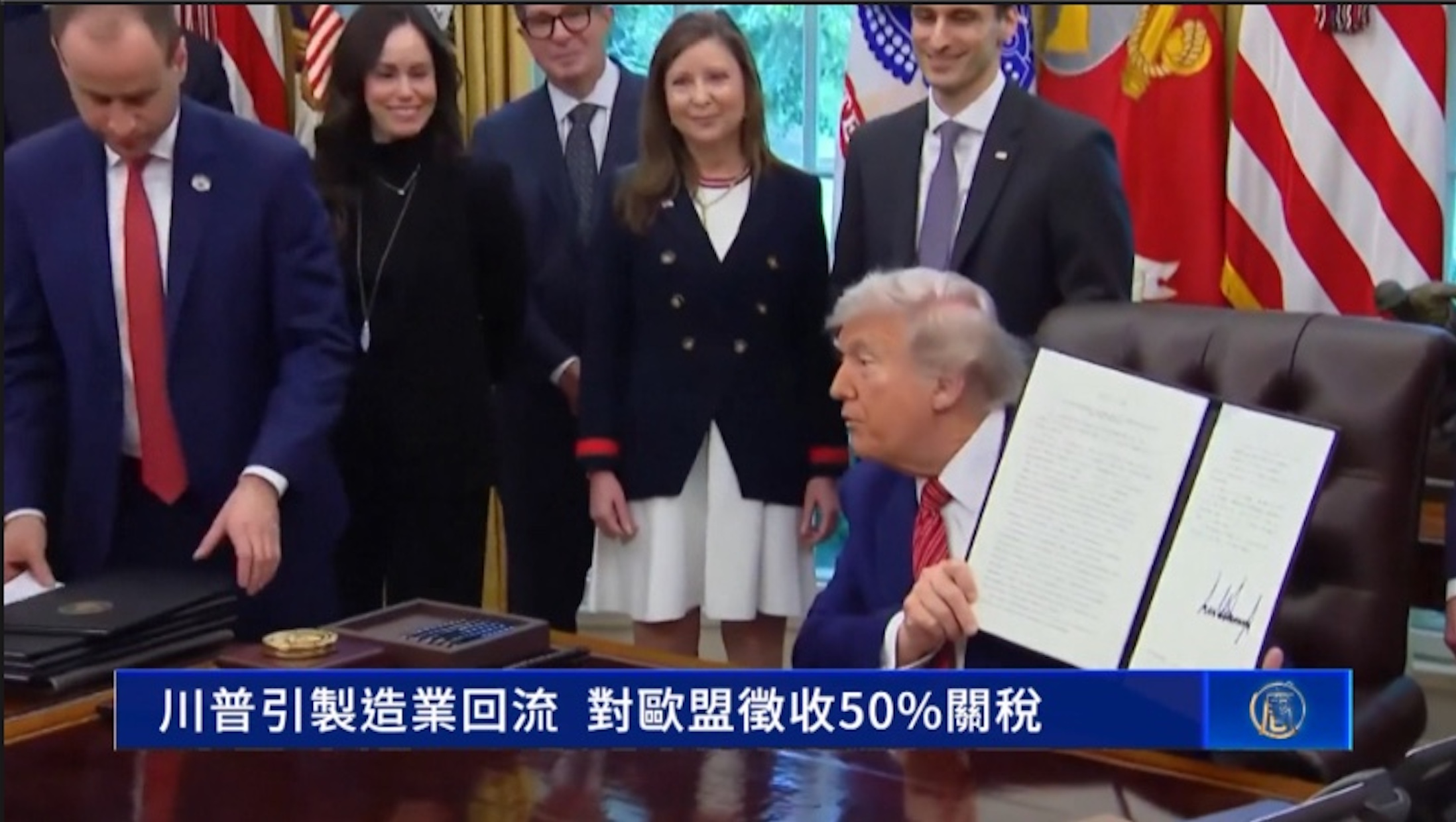 記者 陶明:「美國總統川普週五表示,由於與歐盟的貿易談判毫無進展,他建議從今年6月1號起,對歐盟進口商品徵50%的關稅,但如果產品是在美國製造或組裝,將不受關稅的限制。」