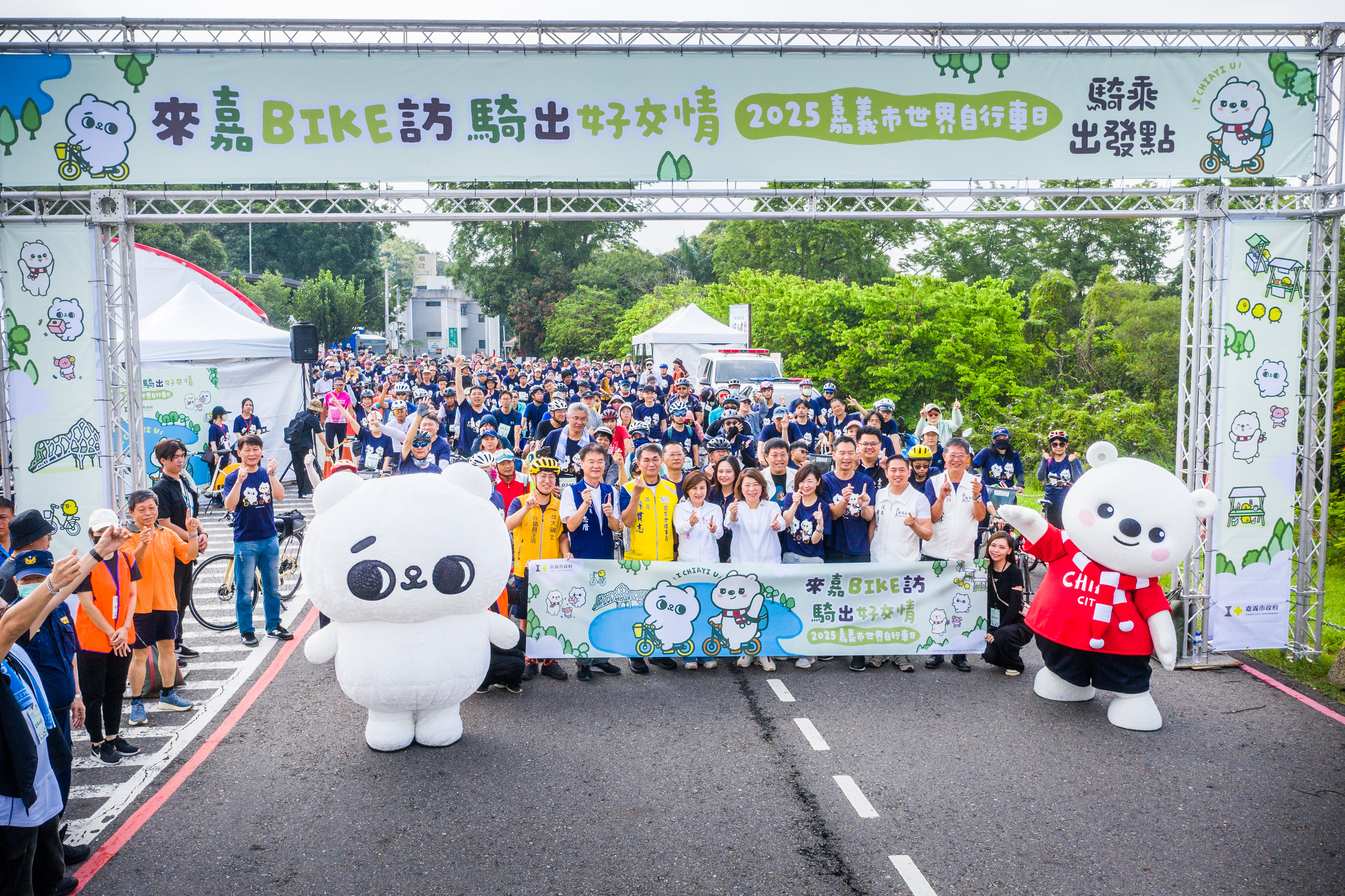「來嘉BIKE訪」自行車活動,1500位車友齊聚遊蘭潭,大白熊x爽爽貓萌翻全場。 (嘉義市政府提供)