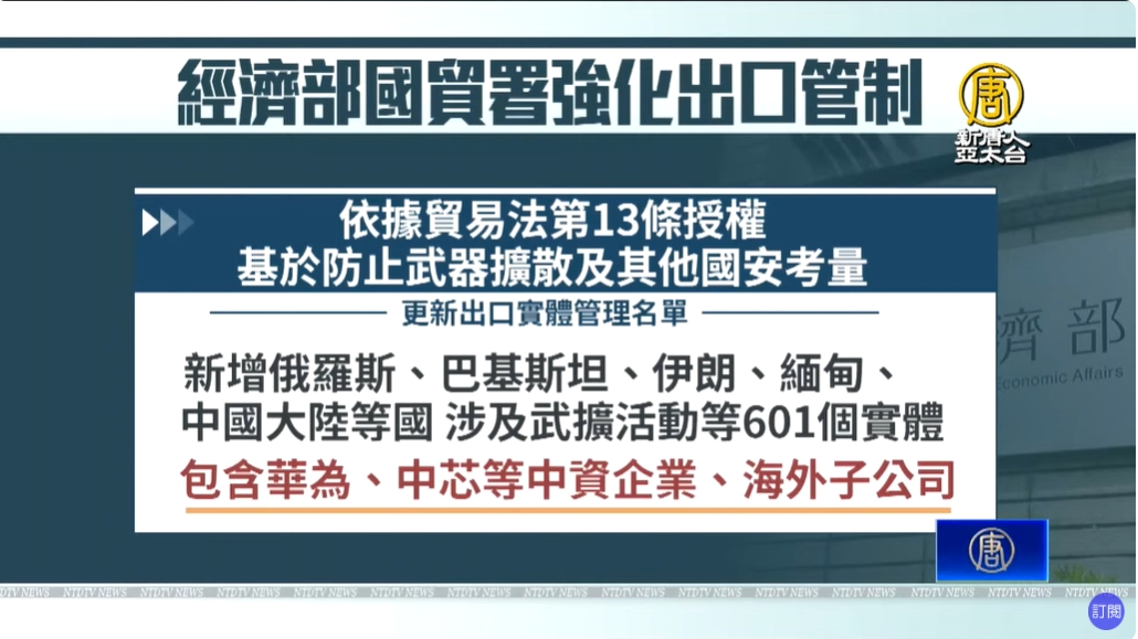 【新唐人亞太台 2025 年 06 月 16 日訊】外媒報導,台灣政府正式將中企華為與中芯,納入出口實體管制名單,未來廠商出口,必須事前申請並獲得政府核准,台灣經濟部15日證實,基於國家安全、防止武器擴散原則,6月10日已經公布相關清單,專家判斷,台灣跟進美國封堵政策,也將衝擊中國企業半導體、AI晶片製造能力。