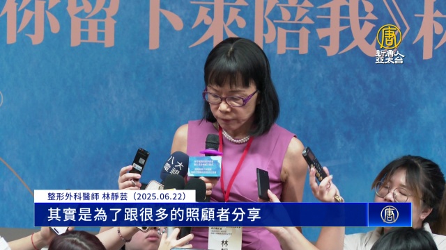 【新唐人亞太台 2025 年 06 月 23 日訊】前衛生署長林芳郁的夫人、整形外科醫師林靜芸,週日(22日)舉辦新書記者會,書中記錄陪伴丈夫對抗失智症的點滴,林靜芸在記者會中,哽咽感謝來自各方的協助,也談到從原本不想公開丈夫病情,到現在願意承認與坦白,是希望能與更多照顧者分享經驗。