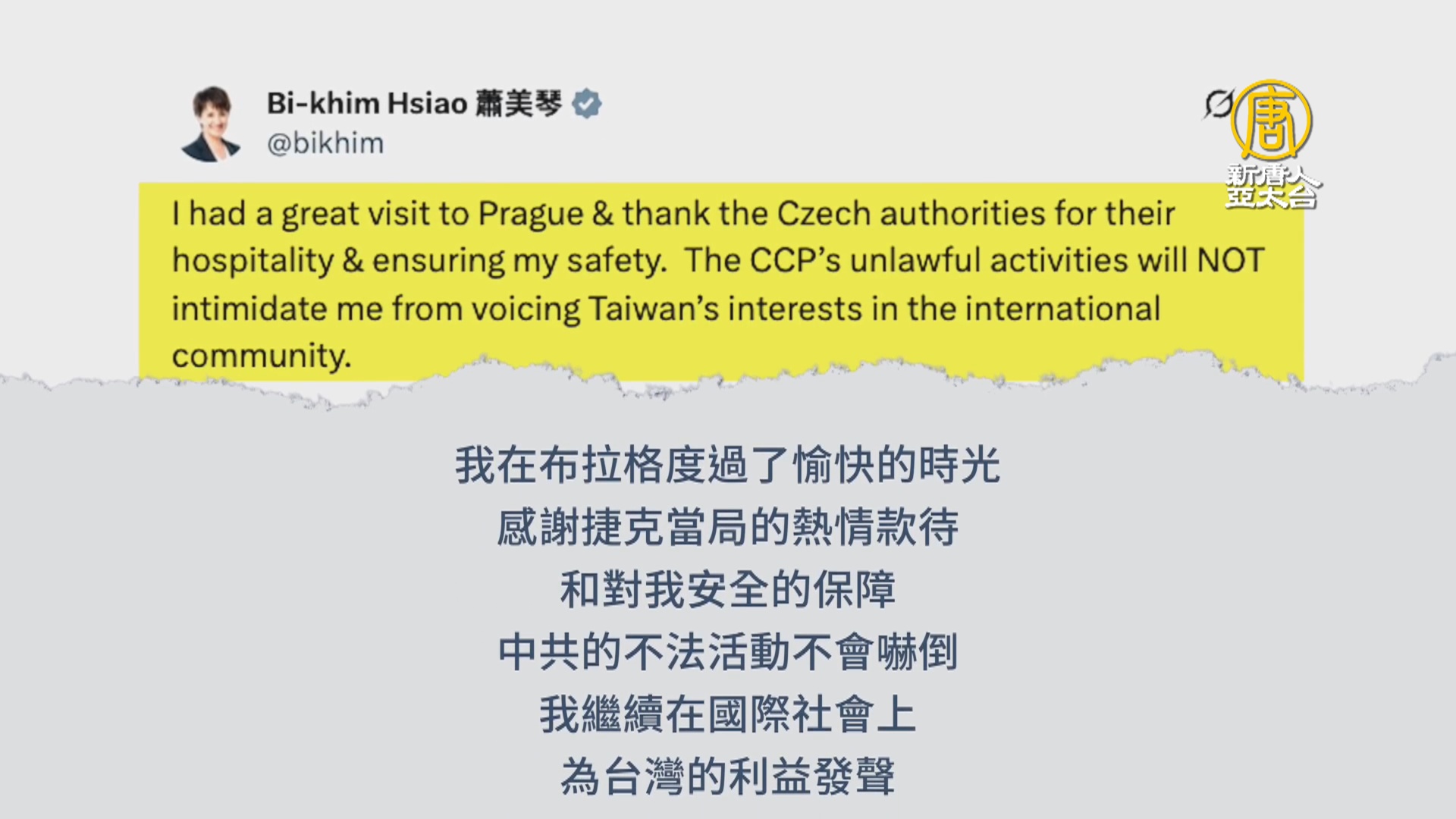 中華民國副總統蕭美琴,週六(6月28日)在社交媒體X上帖文說:「我在布拉格度過了愉快的時光,感謝捷克當局的熱情款待和對我安全的保障。中共的不法活動不會嚇倒我繼續在國際社會上為台灣的利益發聲。」