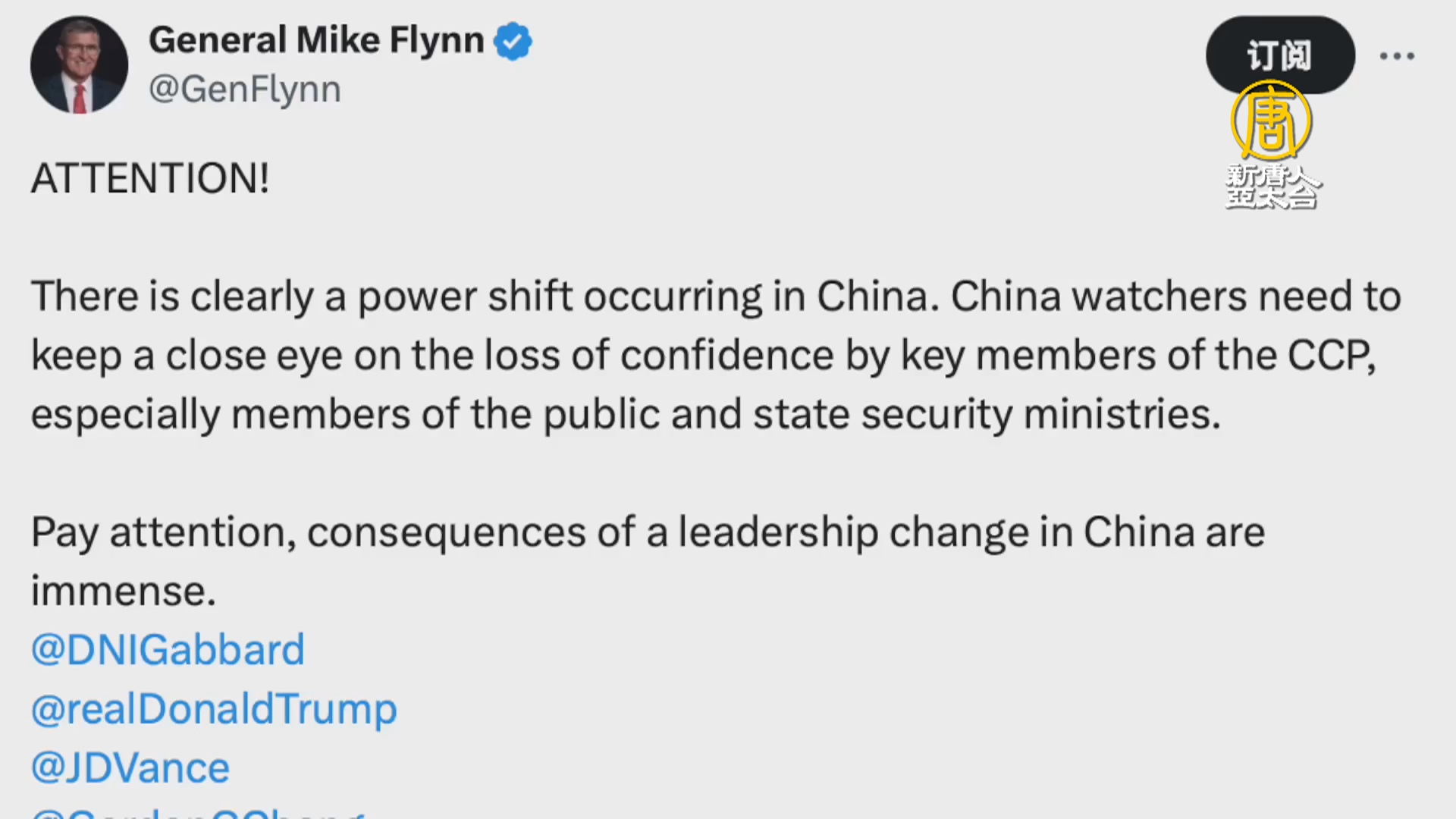 弗林(Michael Flynn)將軍在X發文說:「中國顯然正在發生權力更迭。中國觀察家需要密切關注中共主要成員,尤其是公眾和國家安全部門官員對管理層的信心喪失。」