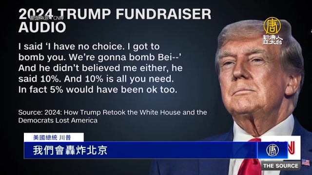 【新唐人亞太台 2025 年 07 月 09 日訊】今天台灣許多媒體關注,美國媒體CNN取得錄音檔爆料,美國總統川普去年在募款活動上表示,自己曾親自警告中共習黨魁,如果中共出兵台灣,美方將空襲北京。在美軍空襲伊朗核設施之後,川普這段錄音格外受關注。