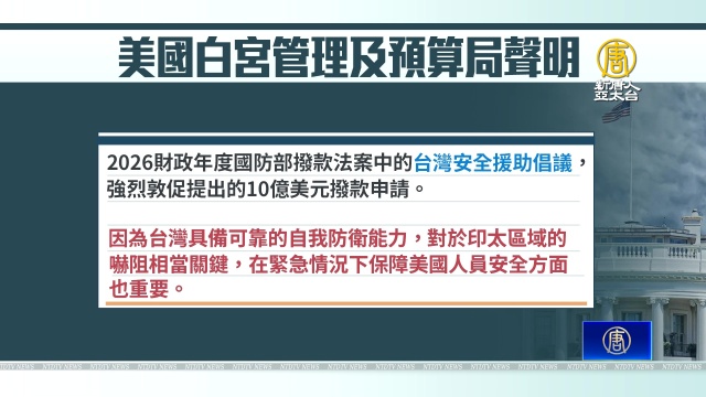 【新唐人亞太台 2025 年 07 月 21 日訊】美國聯邦眾議院18日通過國防部撥款法案,包含「台灣安全援助倡議」編列5億美元,向台灣提供新國防物資、服務,以及軍事教育和訓練。而美國川普白宮近期聲明,政府「強烈敦促」眾議院充分考慮援台10億美元的撥款請求,讓台灣具備可靠的自衛能力。