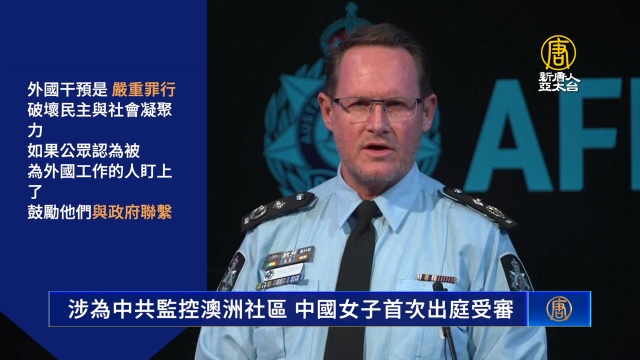 澳洲聯邦警察指控稱,這名擁有澳洲綠卡的中國女子,受中共公安機關的指派,秘密搜集坎培拉一個佛教社團的資訊,涉嫌危害澳洲主權與社區安全。