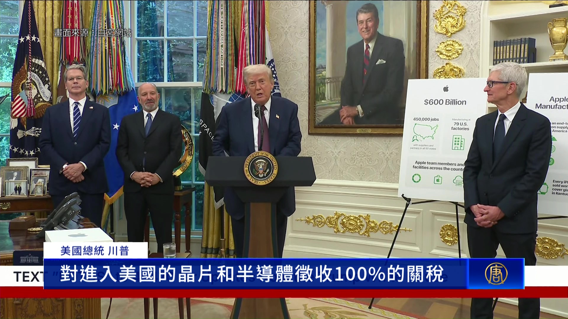 【新唐人亞太台 2025 年 08 月 07 日訊】美國總統川普,對外提前宣布,晶片和半導體,將徵收100%的關稅,但只要在美國設廠就不需繳納,消息成為產業焦點,台積電股價週四大漲,帶動台股盤中站上2萬4千點。