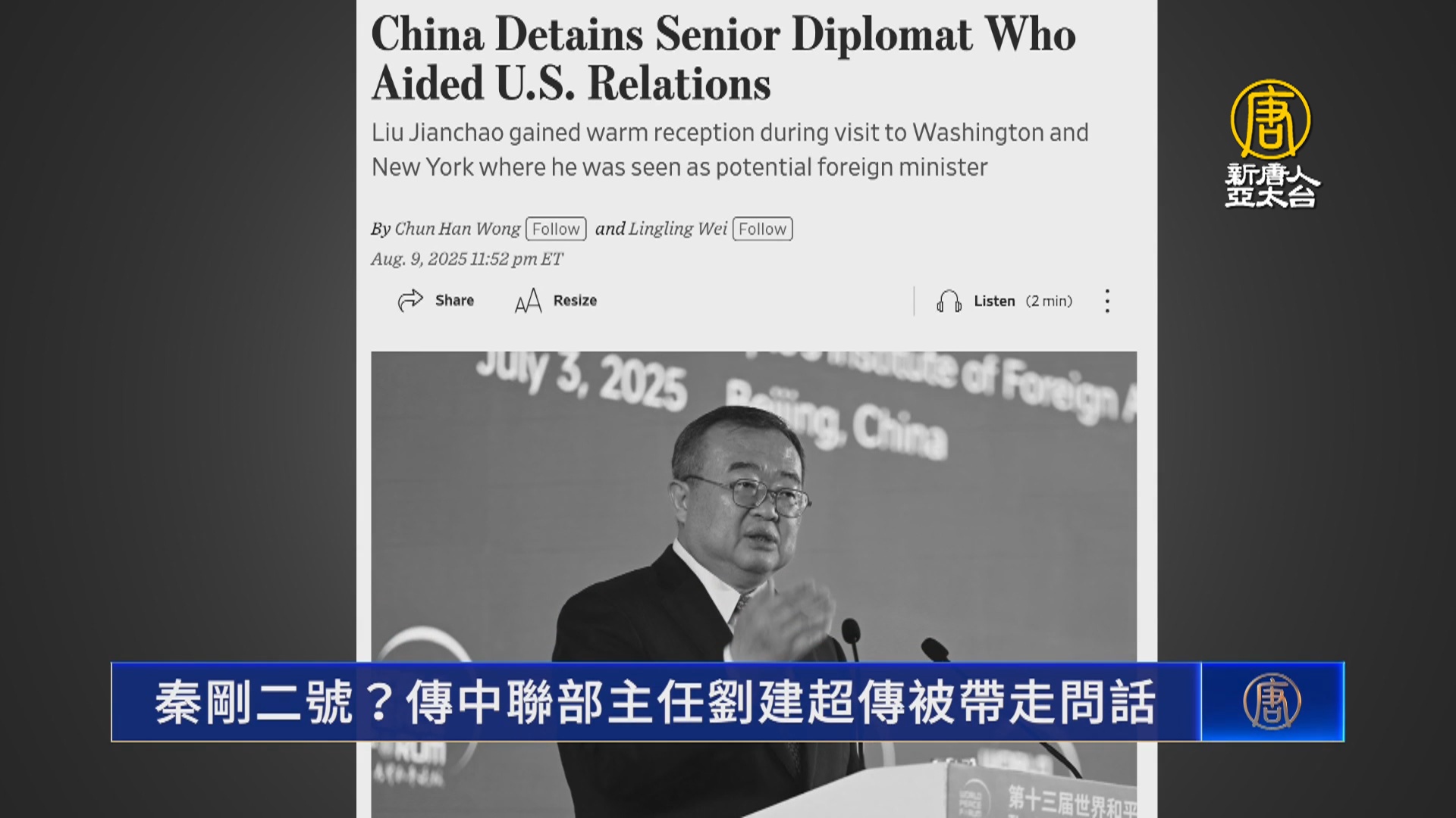 【新唐人亞太台 2025 年 08 月 11 日訊】歡迎回來,中共北戴河會議正在召開,外媒披露,曾被視為中共外長人選的劉建超已被當局帶走調查,原因尚不清楚,如果消息屬實,劉建超將是自秦剛落馬後,中共外交體系內被查的最高級別官員。