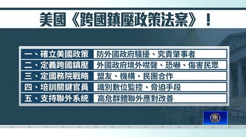 美國這項《跨國鎮壓政策法案》要求:一、確立政策來防止外國政府騷擾、對肇事者追究責任;二、明定跨國鎮壓就是外國政府在境外噤聲、恐嚇、傷害民眾;三、要求國務院帶頭戰略,包含盟友、機構、民團合作;四、培訓關鍵外交、執法或地方官員,識別數位監控跟脅迫手段;五、支持高危險群體聯外應對改善。