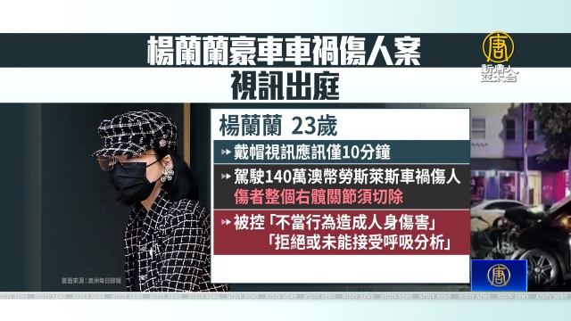 【新唐人亞太台 2025 年 08 月 15 日訊】另一起受到華人網壇關注的案件是,神秘華裔女富豪楊蘭蘭撞車傷人案,今天(15日)上午在澳洲雪梨開庭,但楊蘭蘭僅以視訊的方式出庭,會上戴著帽子不發一語,視訊出庭只有10分鐘,請看我們澳洲記者的報導。
