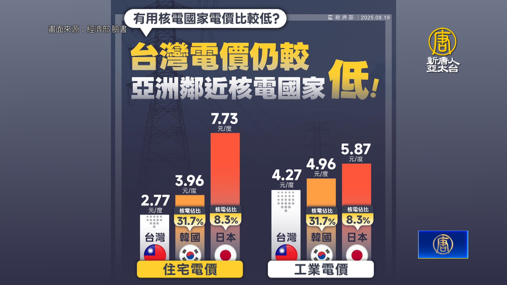 【新唐人亞太台 2025 年 08 月 20 日訊】這個星期六,將要舉行核三重啟公投與七席立委罷免案投票,經濟部昨天(19日)在社群平台發文表示,最近有人說「投不同意、電價就5塊半」,經濟部說,事實上,台灣核電依法到今年5月17日已全數停機,但台灣電價還是比鄰近有核電國家便宜。日、韓核電佔比分別為8.3%跟31.7%,但住宅電價比台灣貴超過4成以上,工業電價也高於台灣。不過,也有網友持反對意見,認為現在台電仍處於虧損狀態。