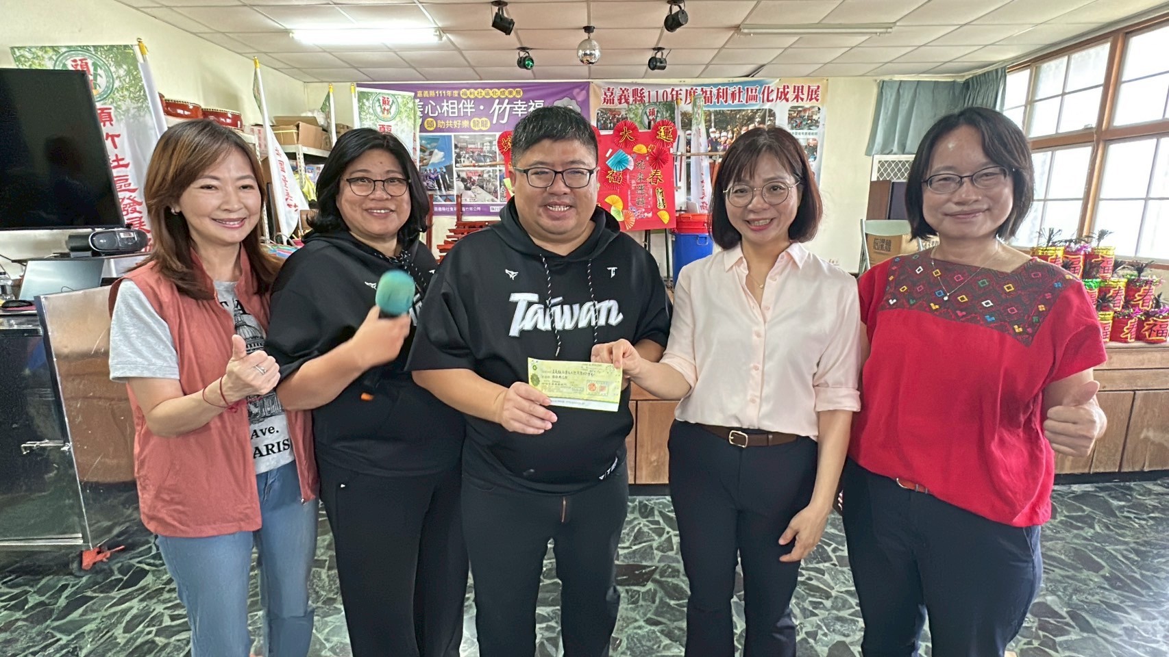 颱風重創嘉義地區,民進黨立委蔡易餘(中)與郭昱晴(左1)、王美惠(左2)、林淑芬(右2)及行政院中部聯合服務中心副執行長吳音寧(右1)21日在義竹鄉頭竹社區舉辦共餐活動,關懷當地民眾。(立委蔡易餘辦公室提供)