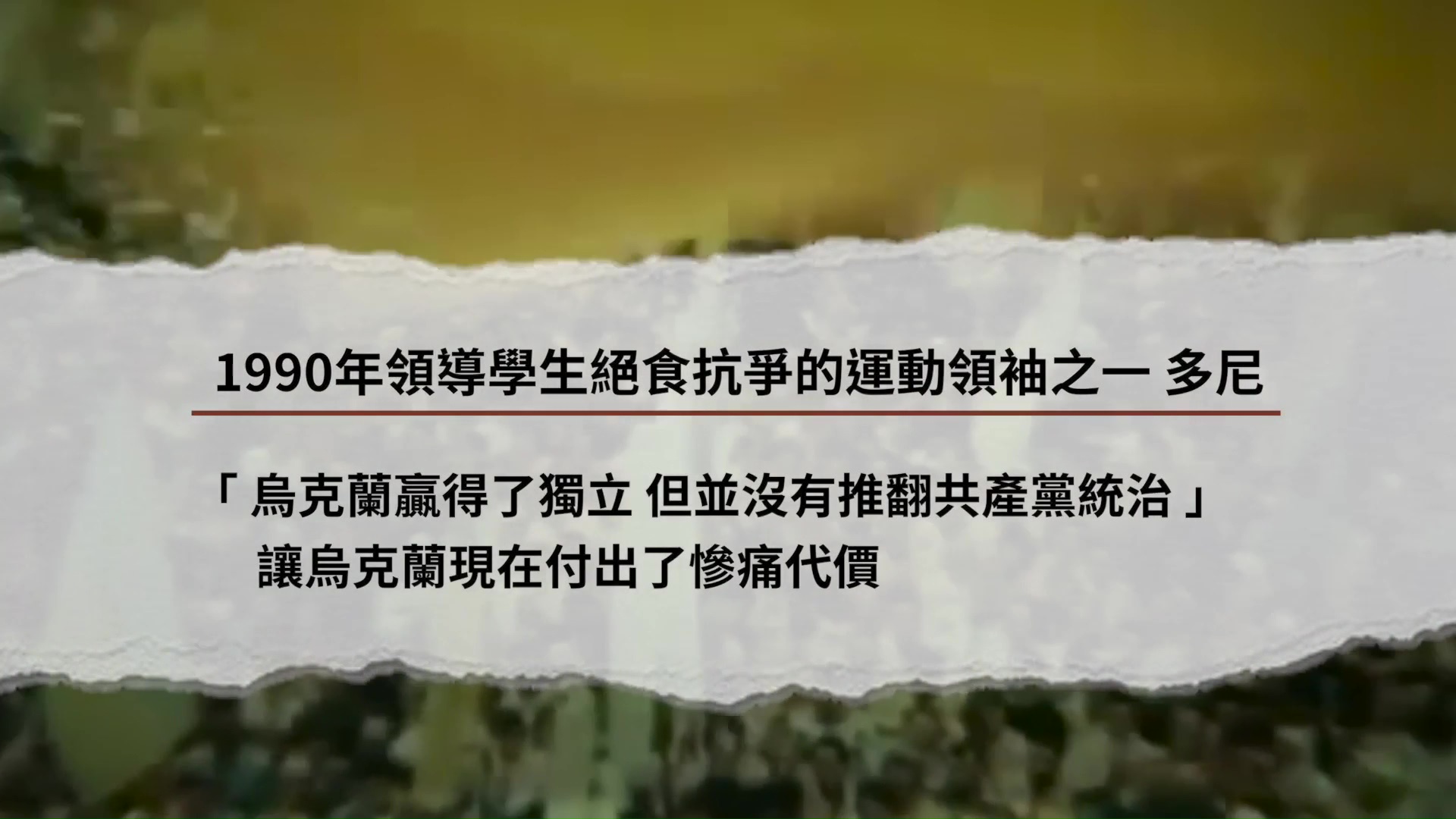 1990年領導學生絕食抗爭的運動領袖之一多尼說,「烏克蘭贏得了獨立,但並沒有推翻共產黨統治」,讓烏克蘭現在付出了慘痛代價。