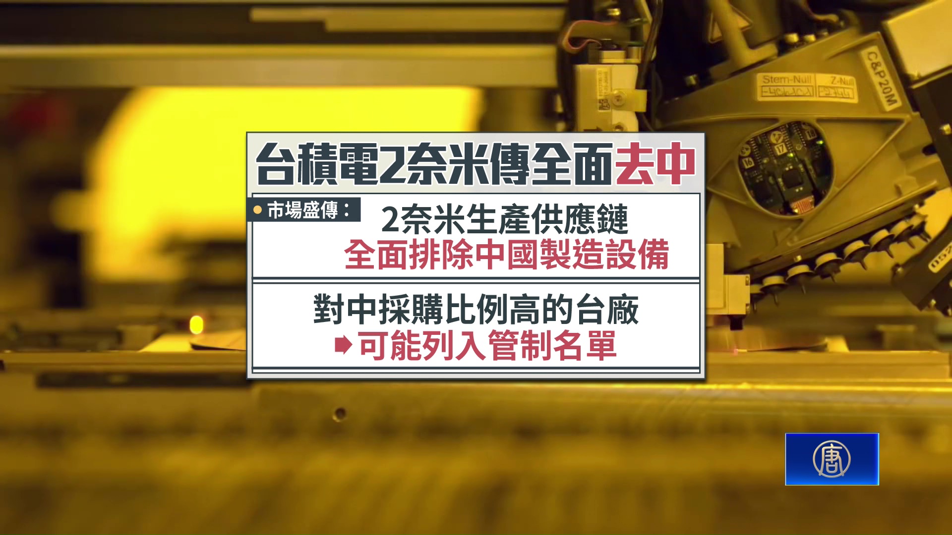 【新唐人亞太台 2025 年 09 月 01 日訊】各國都將晶片視為全球重要戰略物資,美中角力的一大關鍵也在晶片。不僅產業傳出,台積電2奈米生產,要全面排除中國製造設備,另外美方也有意限縮,晶片在中製造規範。