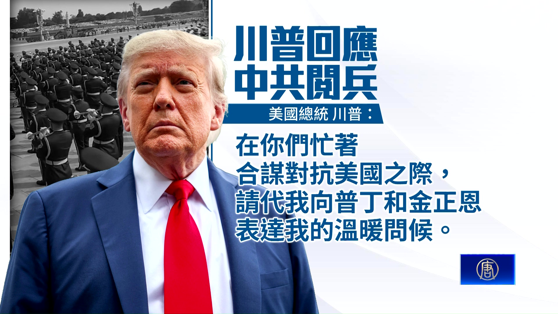 在中共閱兵之際,美國總統川普(Donald Trump)在社群媒體發文,提醒中共黨魁,「美國為了幫助中國,從一個極其不友善的外來侵略者手中獲得自由,所提供的龐大支持與『鮮血』。許多美國人在中國追求勝利與榮耀的過程中犧牲。我希望他們能因為自己的勇敢與犧牲,得到應有的尊崇與銘記!」川普文末還特別警告,「在你們忙著合謀對抗美國之際,請代我向普丁和金正恩表達我的溫暖問候。」