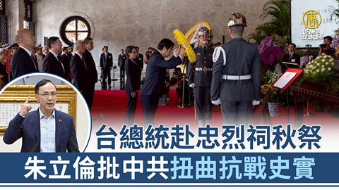 【新唐人亞太台 2025 年 09 月 03 日訊】當中共高調閱兵、扭曲抗戰歷史,中華民國總統賴清德,在93軍人節這天上午到忠烈祠進行秋祭,向國民革命烈士靈位獻花。賴清德強調「台灣不拿槍桿子紀念和平,而是緬懷先烈、記取歷史的教訓。」,國民黨主席朱立倫今天也表示,八十年前的對日抗戰,毫無疑問是中華民國政府領導的,當年唯一領導者是國民黨總裁蔣中正與國民黨,是由國軍在主戰場全面抗戰領導勝利,這個歷史不容篡改,也不容中共扭曲。