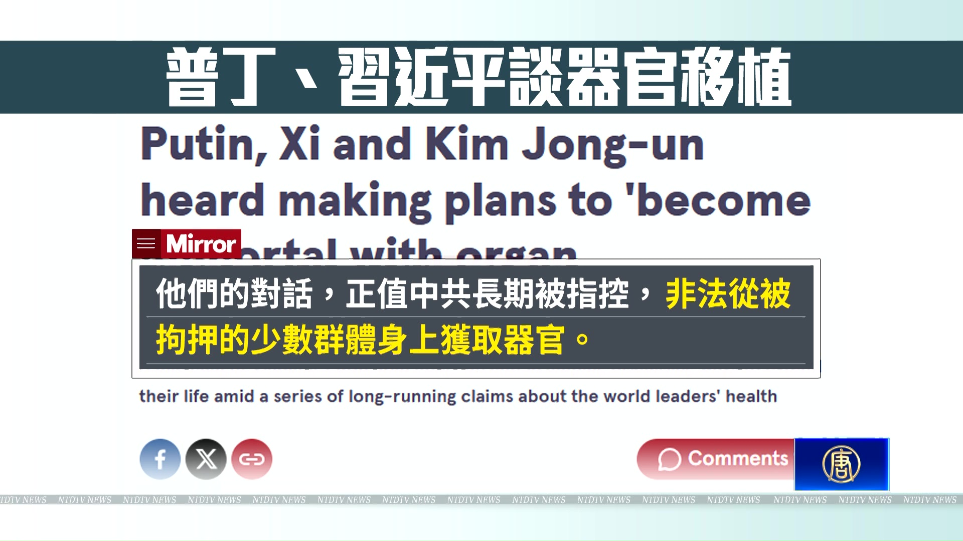 2025-09-04 13:11:53在中共9.3閱兵典禮之際,普丁與習近平談到「器官移植」,還提到「長生不老」的說詞。這個片段在全球播出後,立刻成為西方媒體關注的焦點,美國國會議長斥責這是魔鬼的言論,台灣立委與專家也紛紛提到,中國所謂的器官移植產業,其實涉及中共活摘器官的暴行。