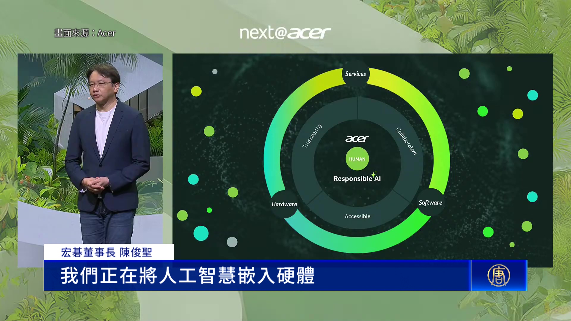宏碁董事長 陳俊聖:「對Acer來說,AI不僅僅是一個工具。這是一種健全性。它必須以人為本,值得信賴且負責任。我們正在將人工智慧嵌入硬體、軟體和服務的各個層面。建構一個生態系統。」