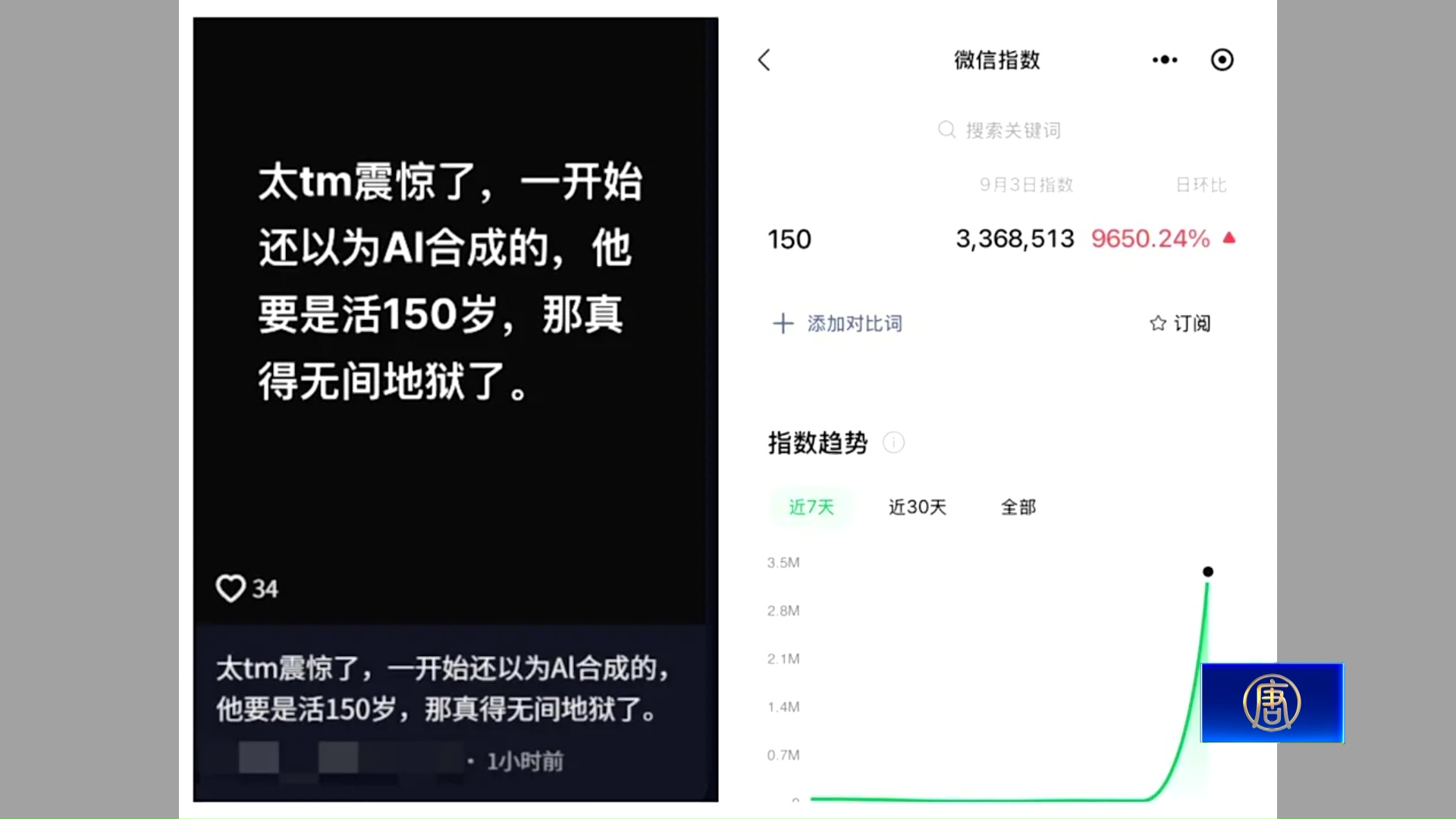 【新唐人亞太台 2025 年 09 月 05 日訊】中共九三閱兵,媒體直播意外錄下中共黨魁和俄羅斯總統普丁的對話,兩人討論「器官移植、長生不老」等議題,習近平甚至笑稱,可能活到150歲,對話內容震驚全球。雖然中共封鎖相關內容,但是閱兵當天,「150」這個數字在微信的搜尋量異常飆升,整體數值相比8月3日暴漲96.5倍,突破336萬次。還有中國網友在抖音哀號「太震驚了,一開始還以為是AI合成的,他要是活到150歲,那真是無間地獄了」。
