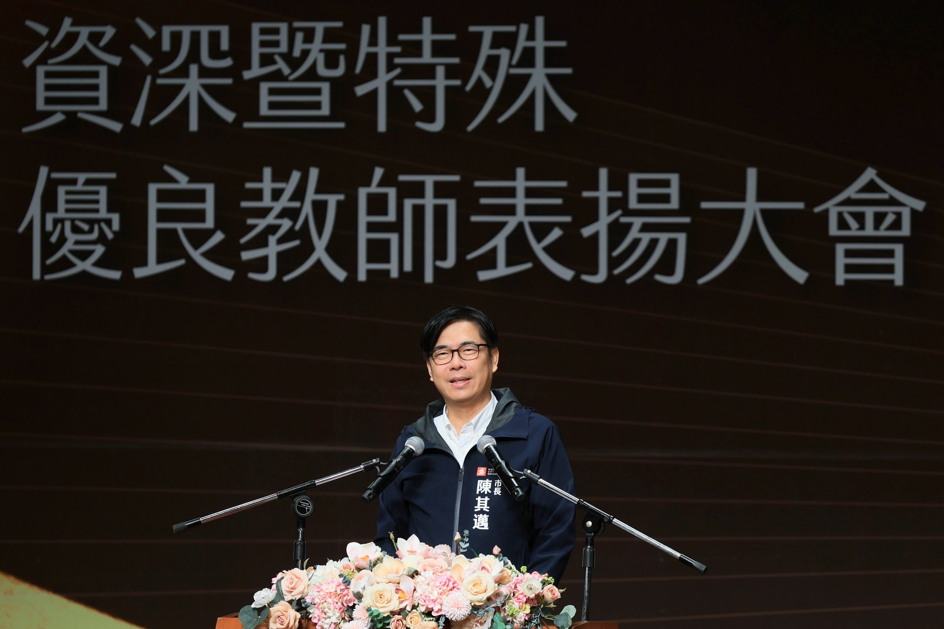 高雄市長陳其邁出席114年度高雄市資深暨特殊優良教師表揚大會頒發獎項,感謝全體教師長年來對高雄教育的深耕與付出,並送上教師節祝福。(高雄市教育局提供)