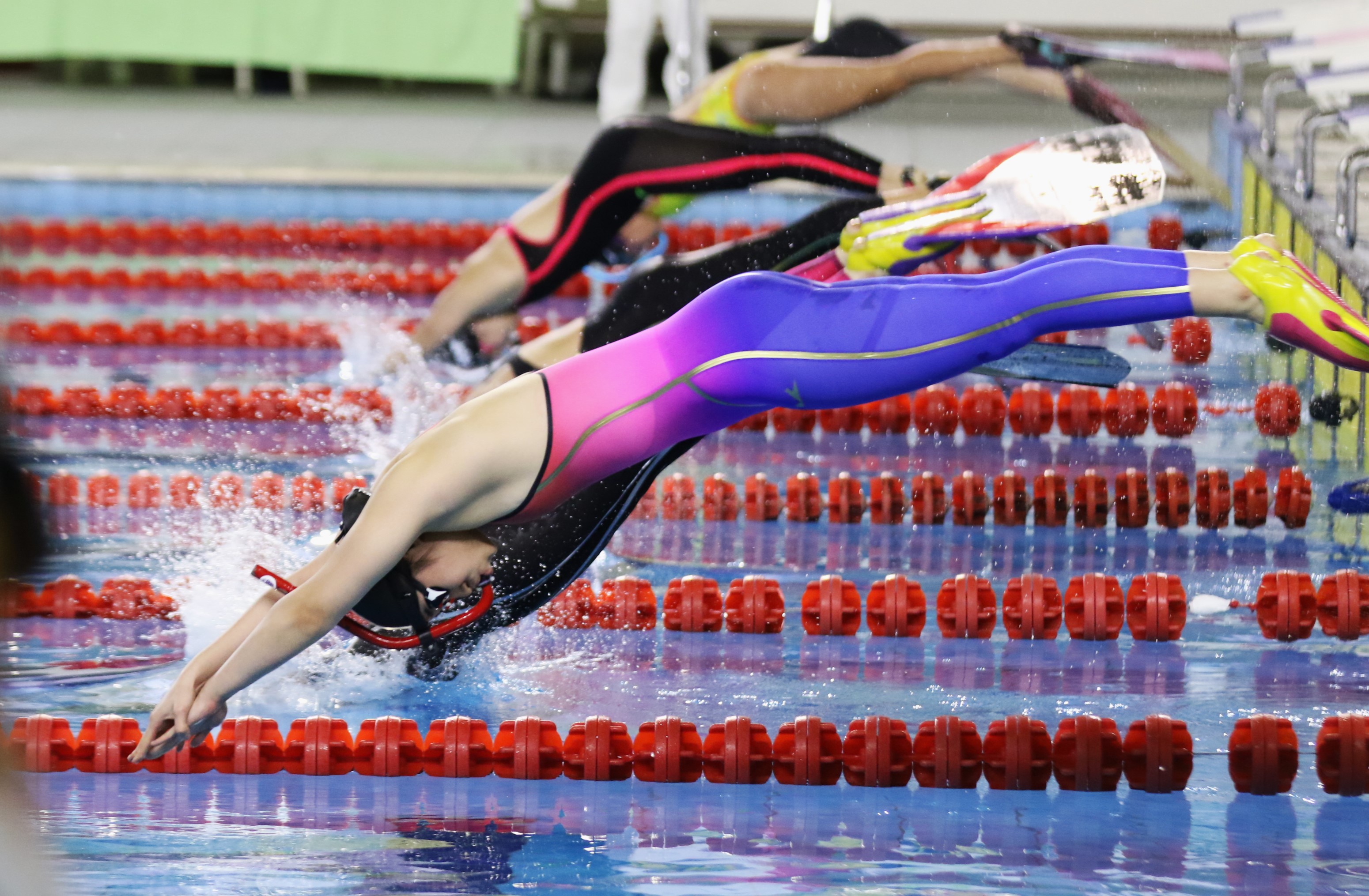 蹼泳選手奮力一游,展開激烈競技。(高雄市運發局提供)